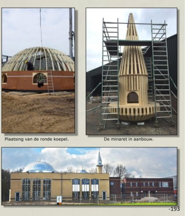 plek voor gebedsruimtes maar ook voor ontmoetingsruimtes. Plaatsing van de ronde koepel. De minaret in aanbouw.
