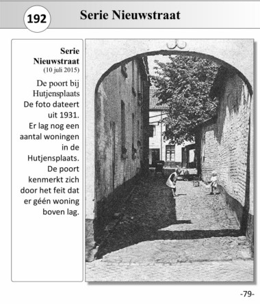 192 Serie Nieuwstraat Serie Nieuwstraat (10 juli 2015) De poort bij Hutjensplaats De foto dateert uit 1931. Er lag nog een aantal woningen in de Hutjensplaats. De poort kenmerkt zich door het feit dat er géén woning boven lag. -79-
