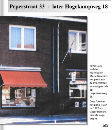 Peperstraat 33 - later Hogekampweg 18 Rond 1936 verlaten Mathieu en Marie Geominy het pand aan de Peperstraat en vestigen zich op Hogekampweg 18. Deze foto van het pand is van na 1977 als slager Hamans hier als slager begint. -163-